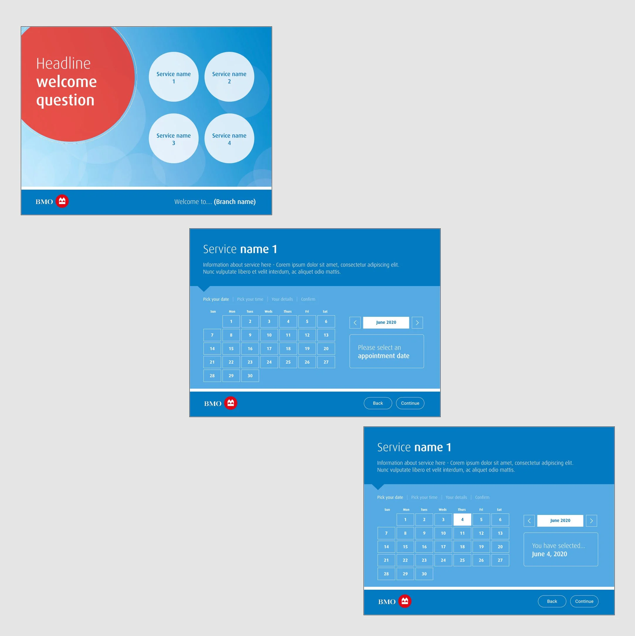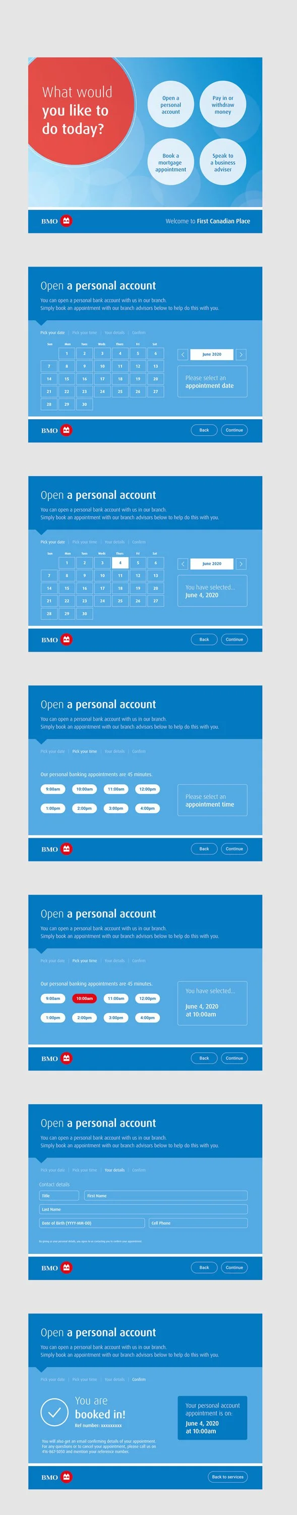 I developed the idea further in the brand style and colour palette of BMO. Placeholder text was incorporated to give more context of how the screen flow would work and aid the copywriters when devising the text to add.