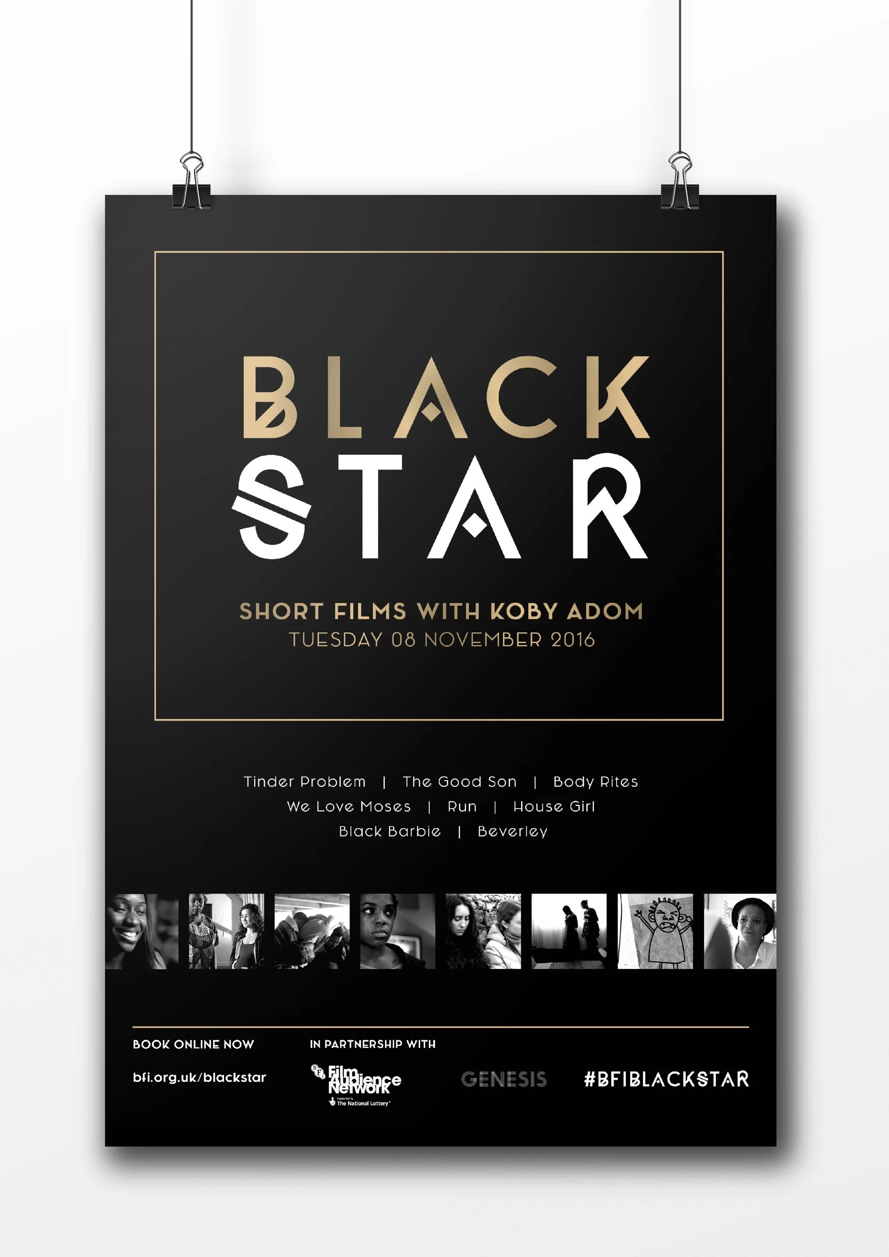 I was approached by London Film Director and producer Koby Adom to design the promotional artwork for an event he was curating as part of the BFI Black Star season at Genesis Cinema, Whitechapel. The event featured the screening of eight specially selected short films. The BFI designed a 'Black Star' logo for the campaign and produced brand guidelines for the use of it. All design work was artworked by myself, adhering to the brand guidelines supplied. All artwork had to be sent to the BFI, Genesis Cinema and Koby Adom for approval.